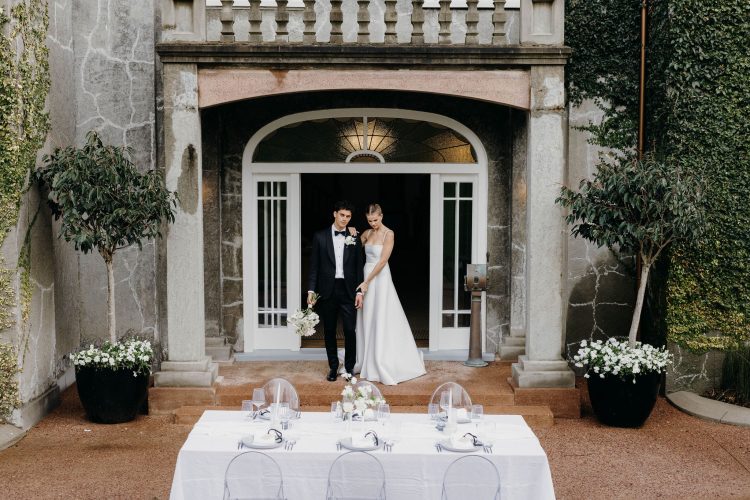 This editorial shoot blends traditional elegance with modern style at The McCallum Residence, featuring timeless wedding attire and décor trends. Highlighted elements include Victoria Ghost Chairs, diverse dinnerware, and chic linens, captured by Ryan Watts Photo with contributions from multiple vendors, enhancing the luxurious, contemporary ambiance.