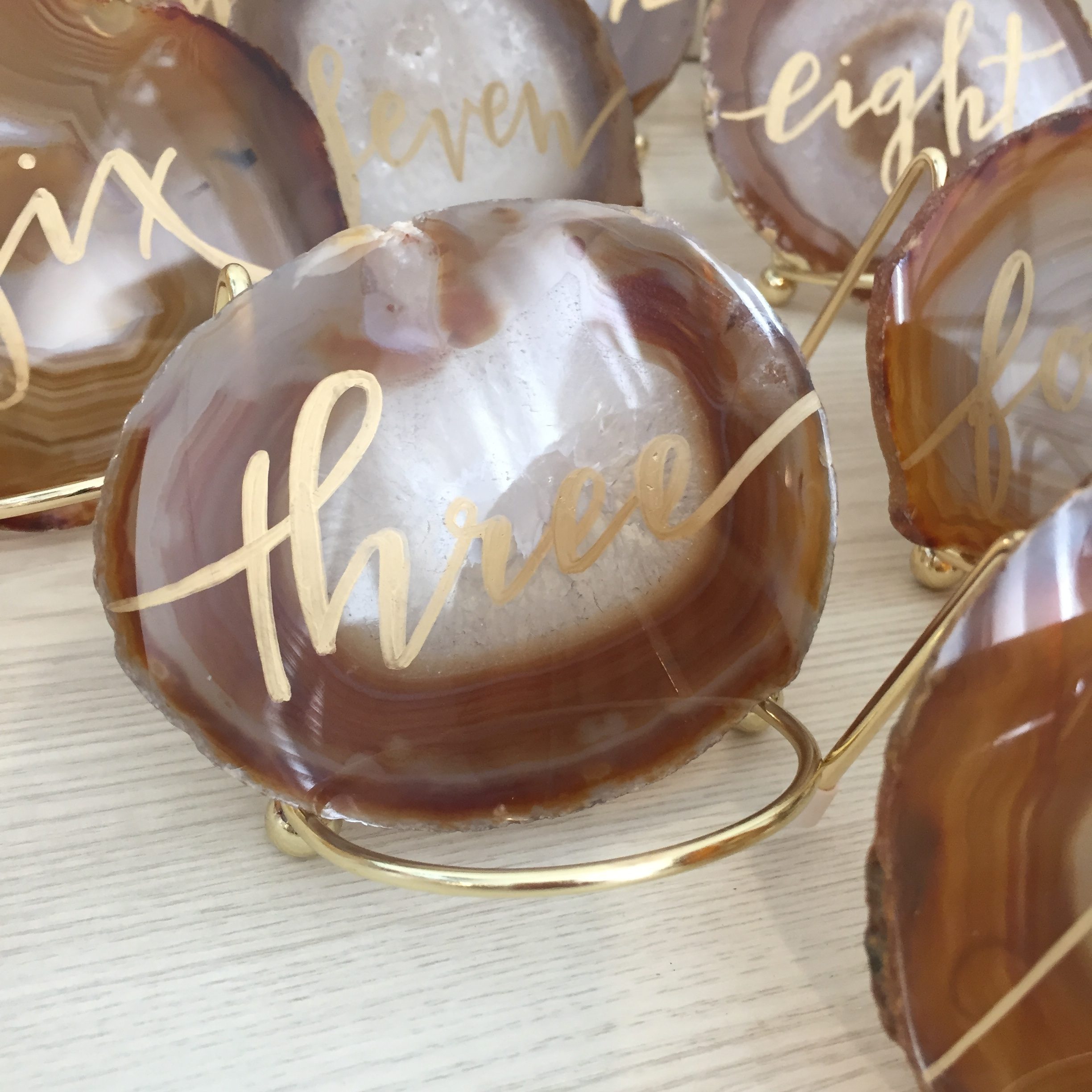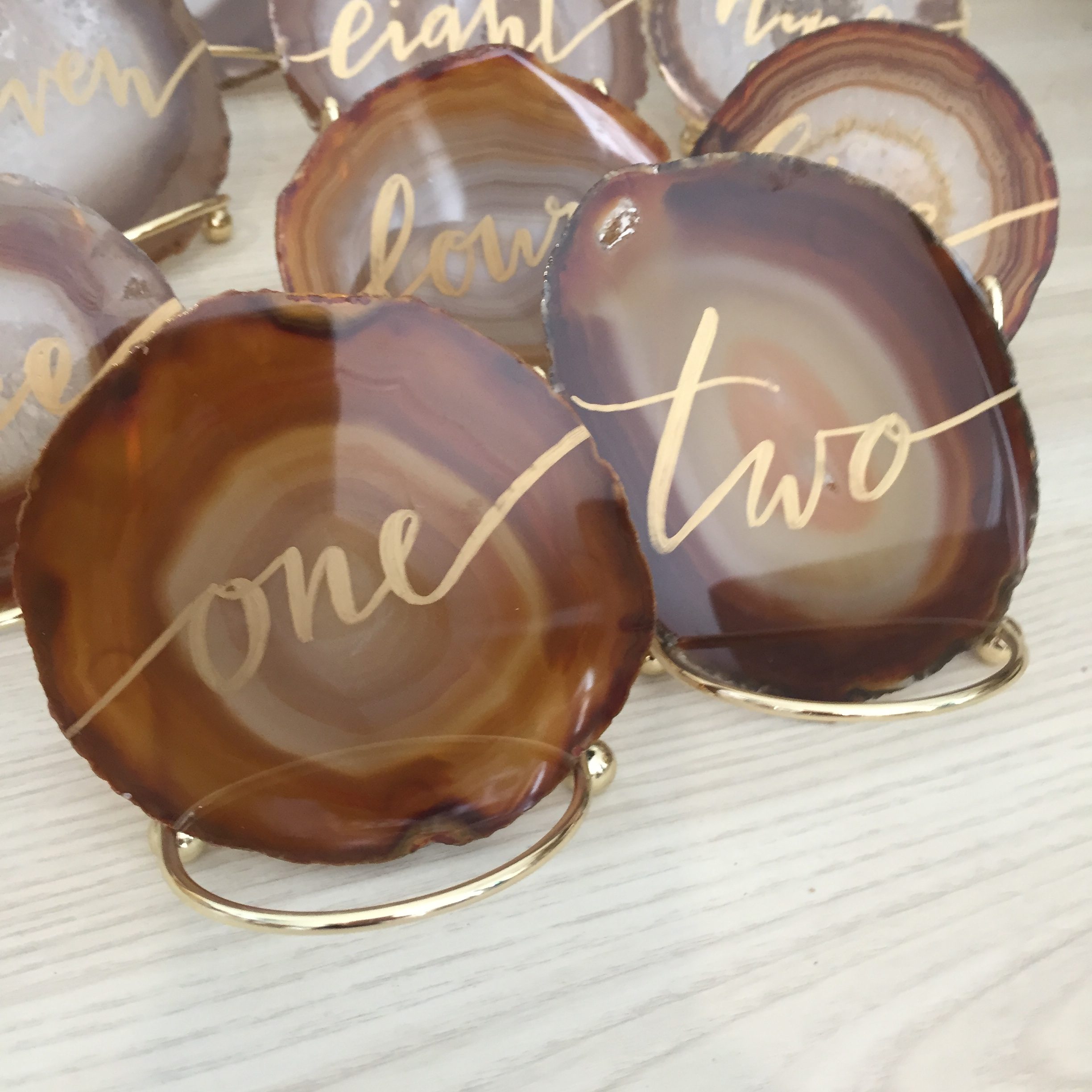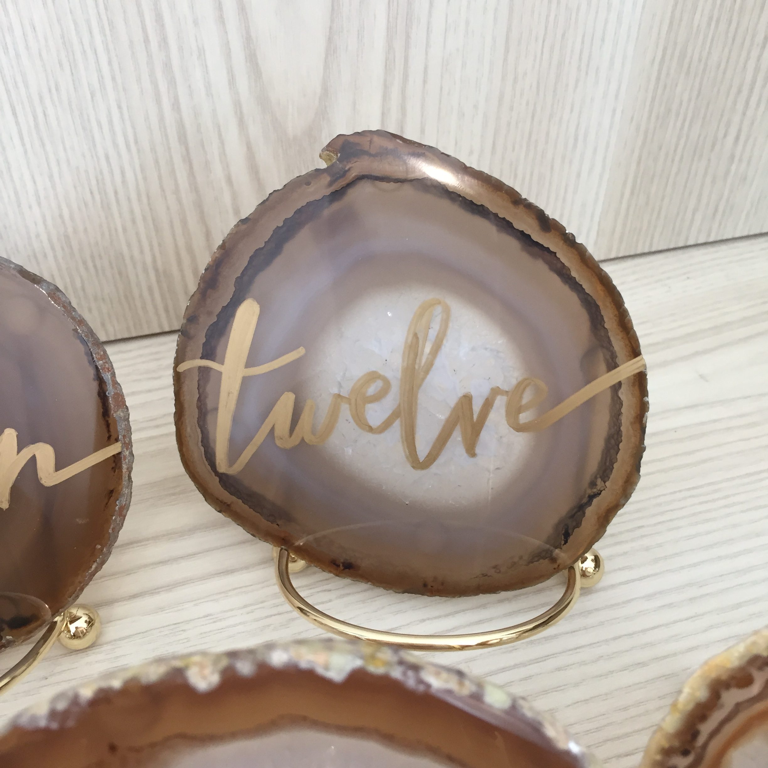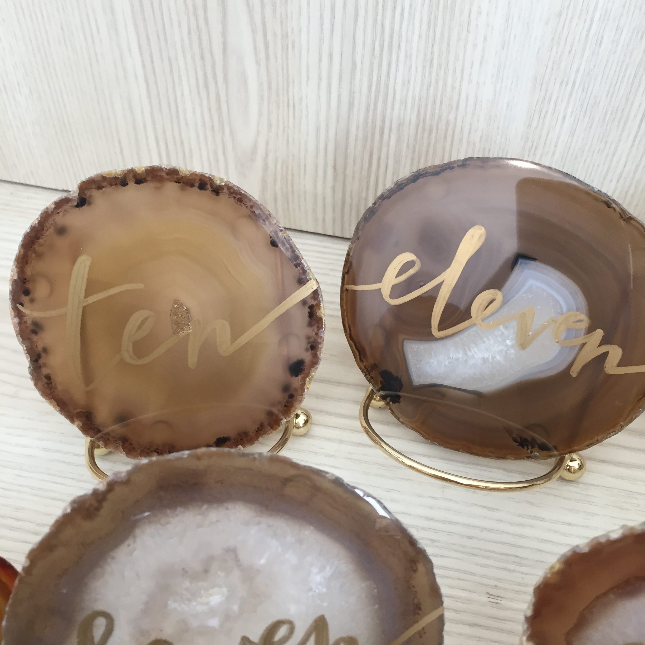 Stunning natural brown agate slices with gold calligraphic numbers written on them.  They are supplied with a small gold stand to sit on.  Use with or without the stand.