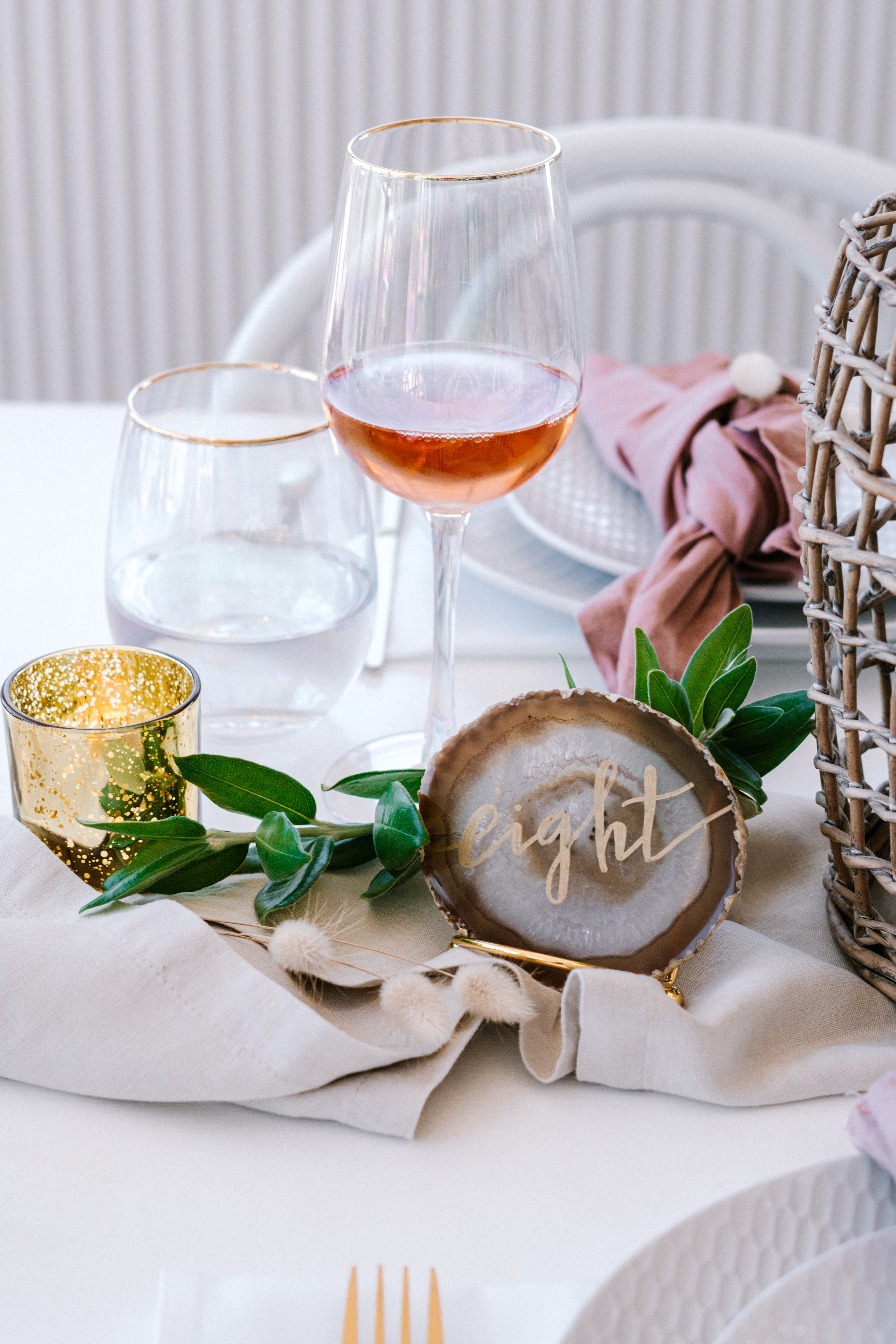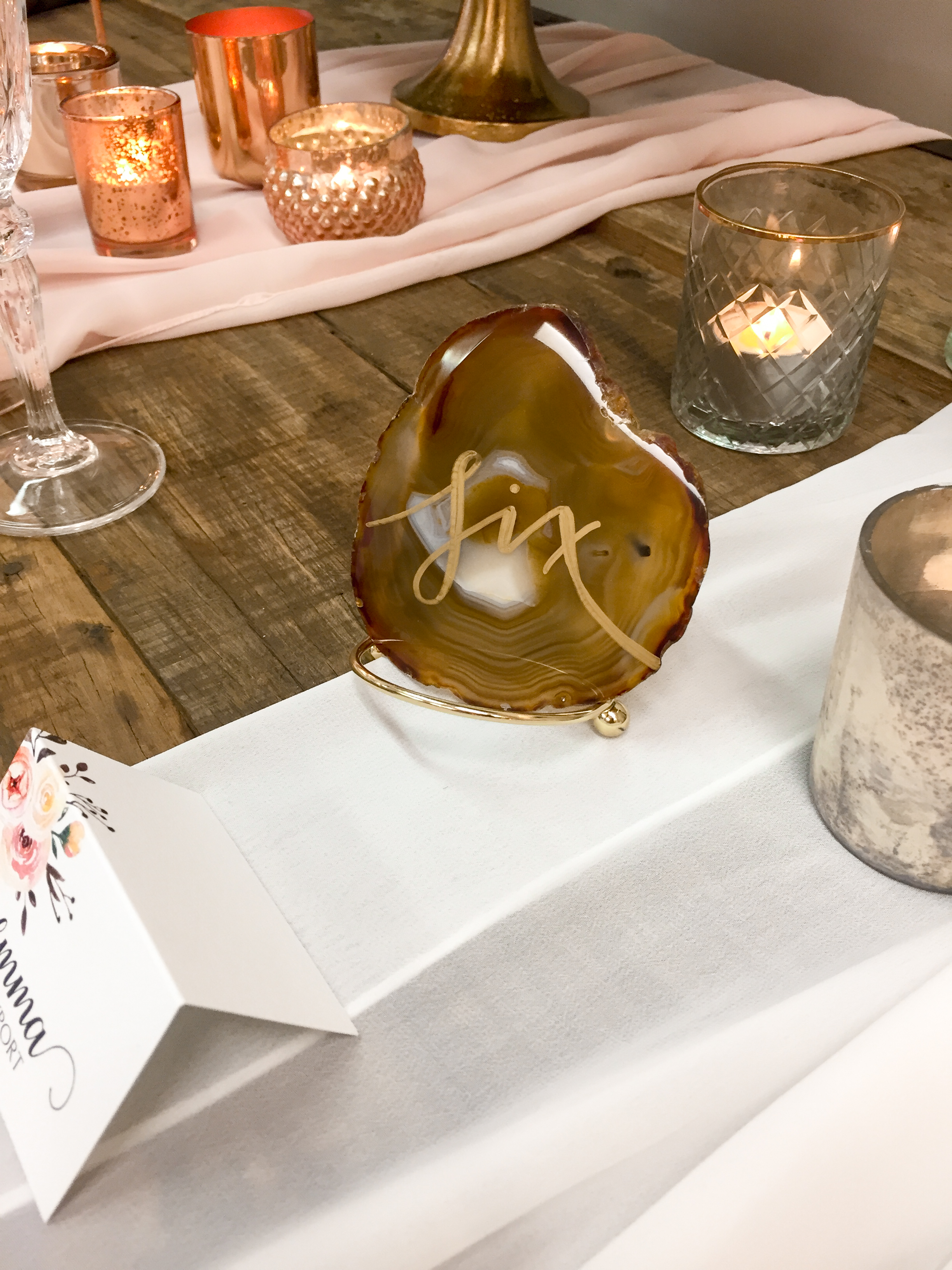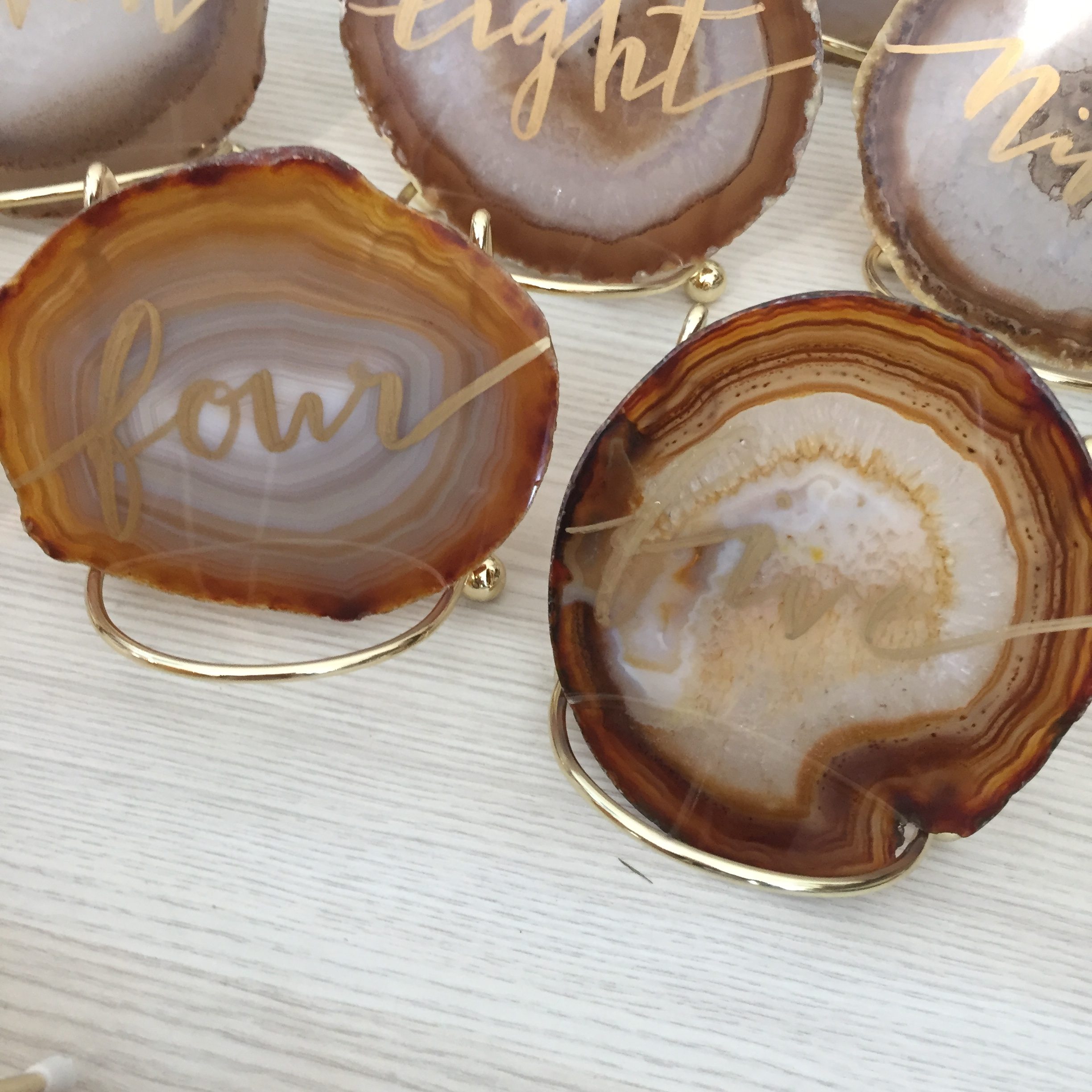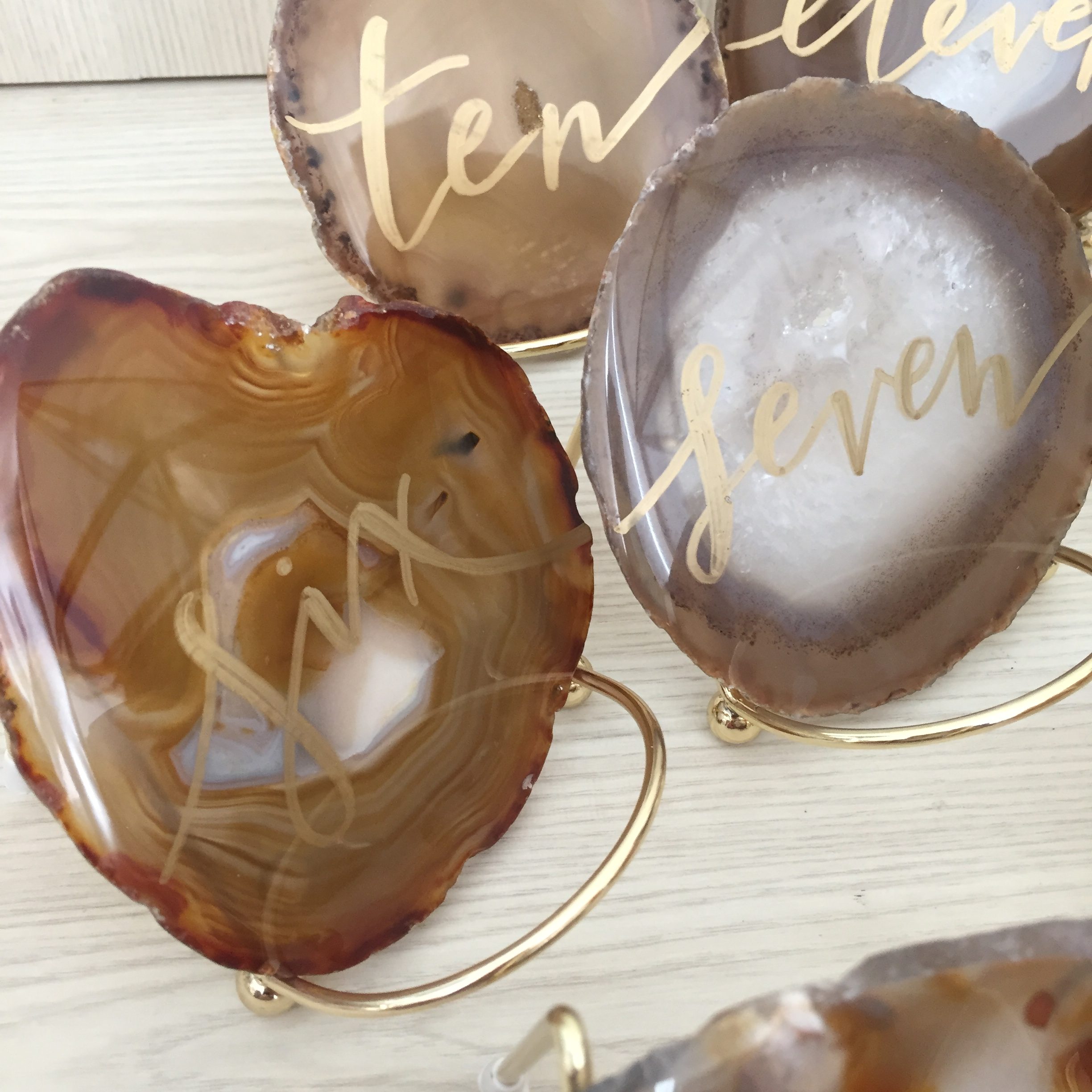 Stunning natural brown agate slices with gold calligraphic numbers written on them.  They are supplied with a small gold stand to sit on.  Use with or without the stand.