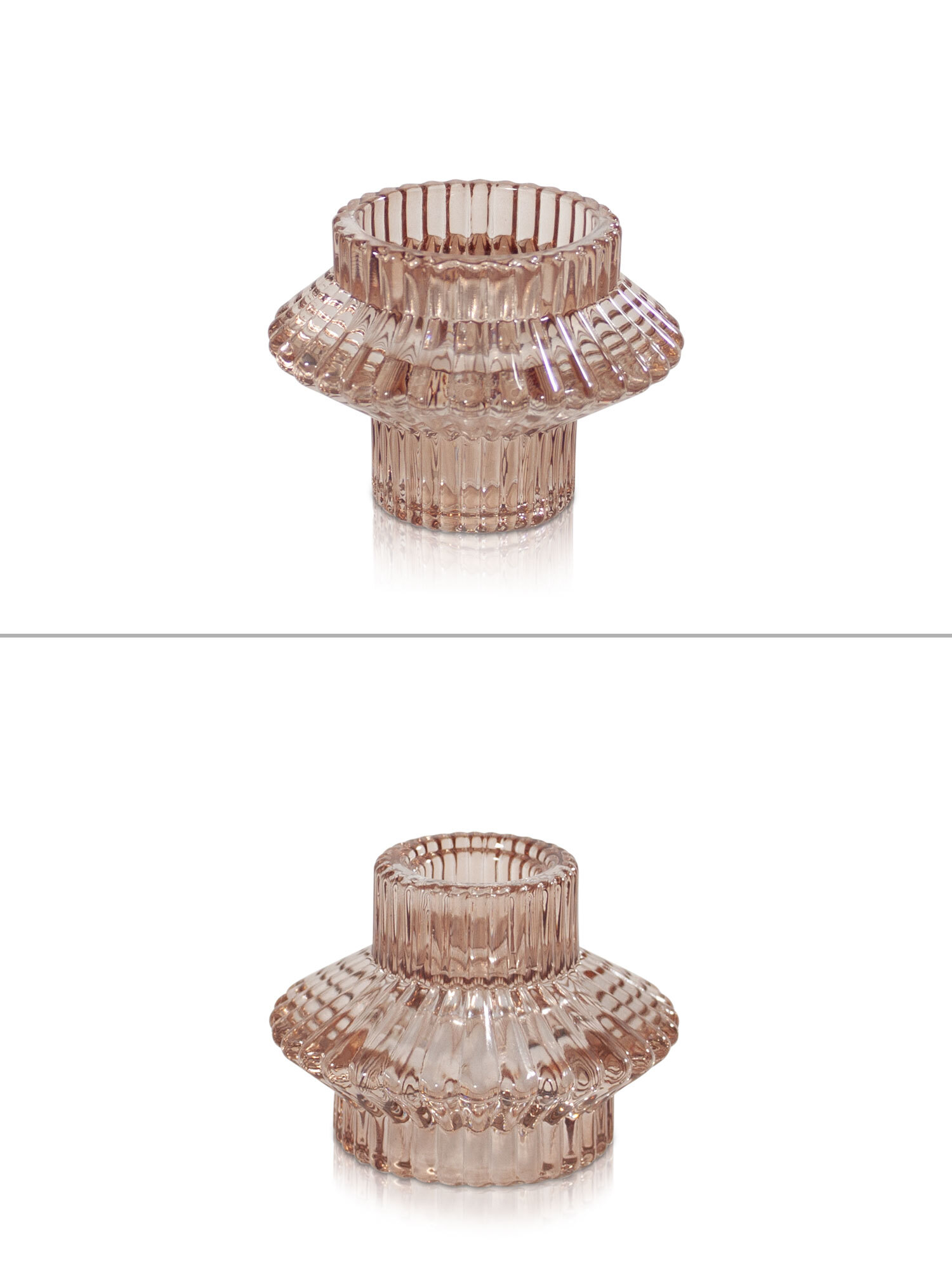 The Aida vintage glass candleholder has a striking, retro silhouette and elegant pleated glass finish. Cleverly designed to suit multiple candle types. Simply flip this duo candle holder over to hold tealight candles or use narrow side up for both Dinner and Taper candles