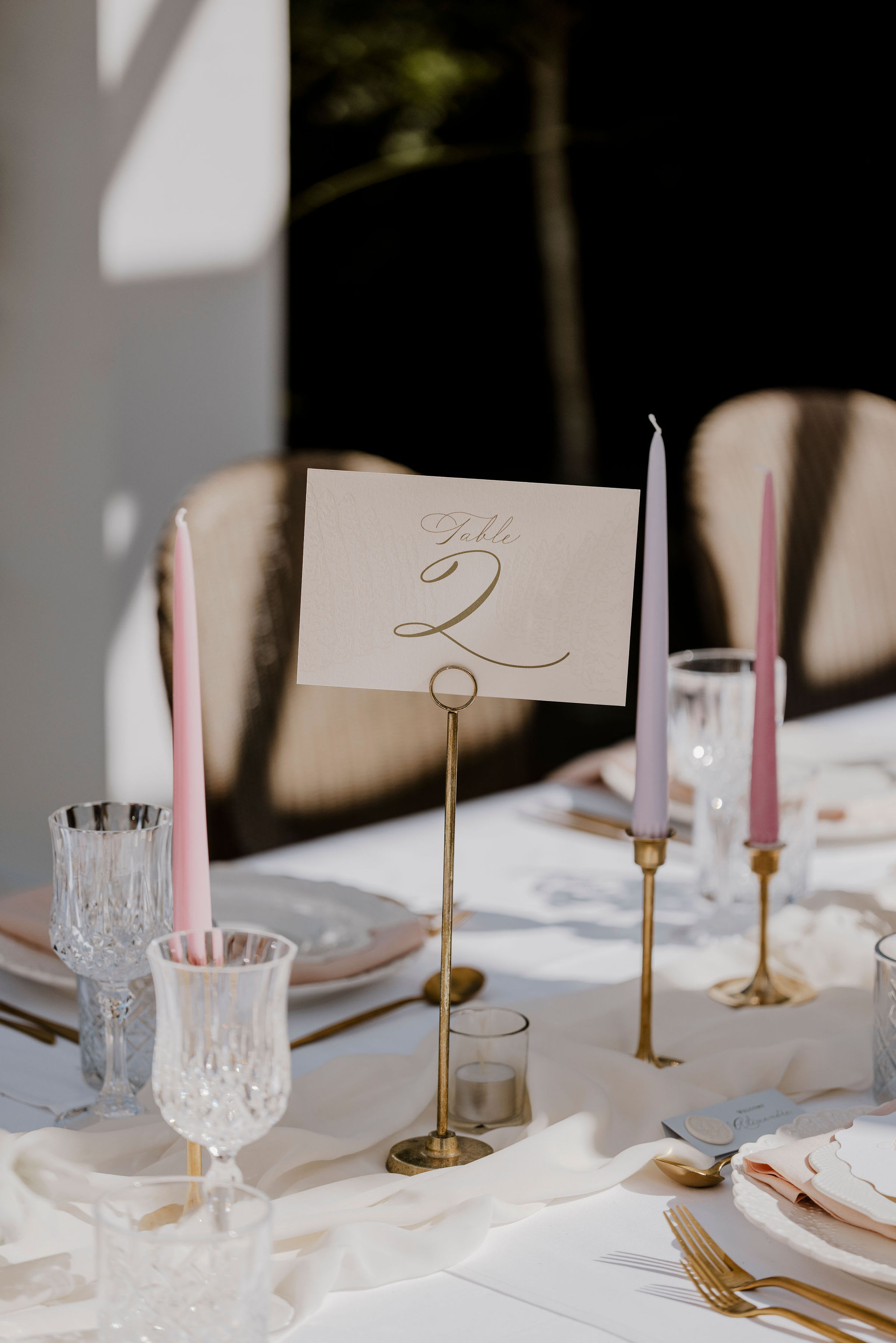 Our Arch Script acrylic table numbers are the perfect addition to your beautiful day.  Made in a neutral peach acrylic with white script numbers they’re sure to work with many tablescapes.  Please note that these table numbers are one-sided.