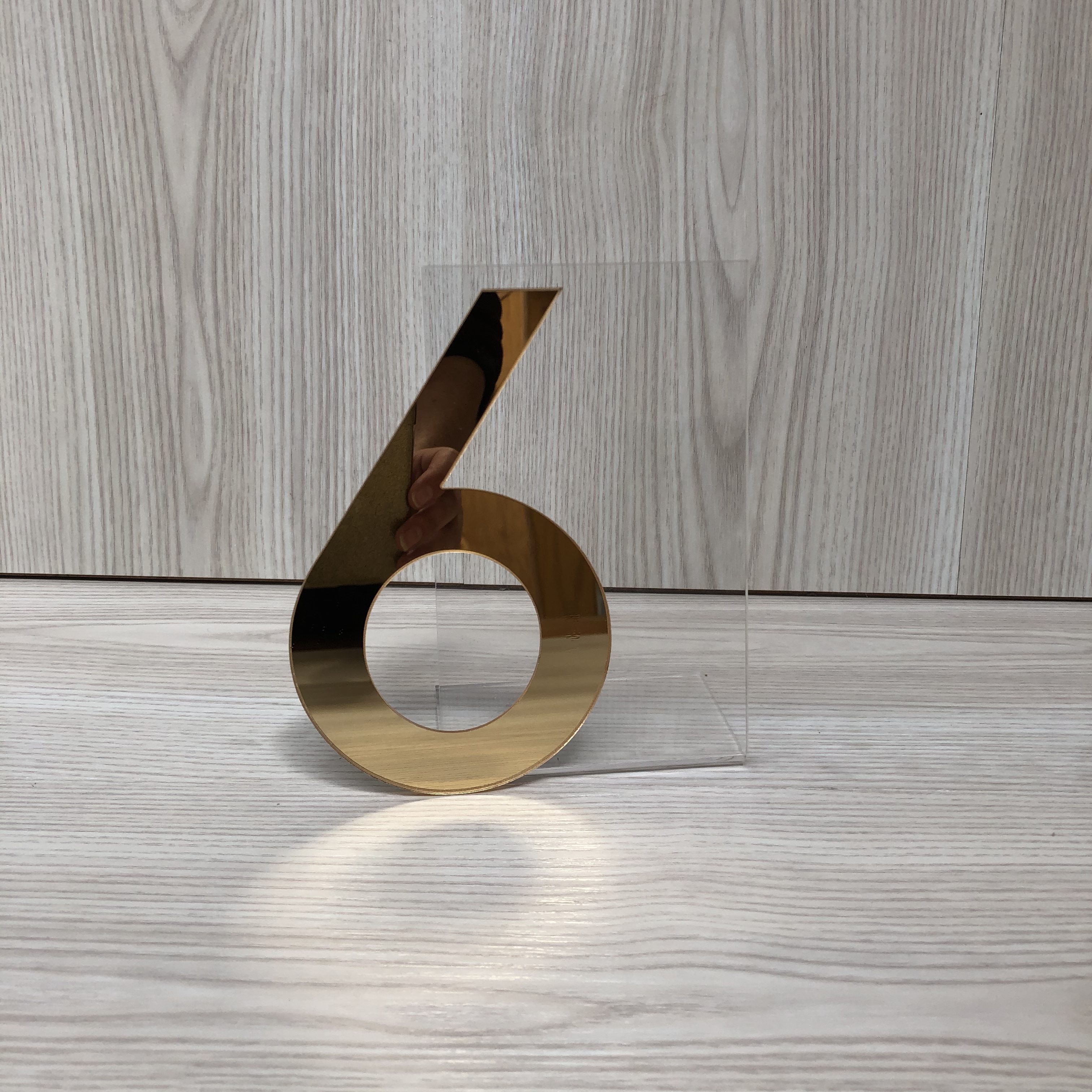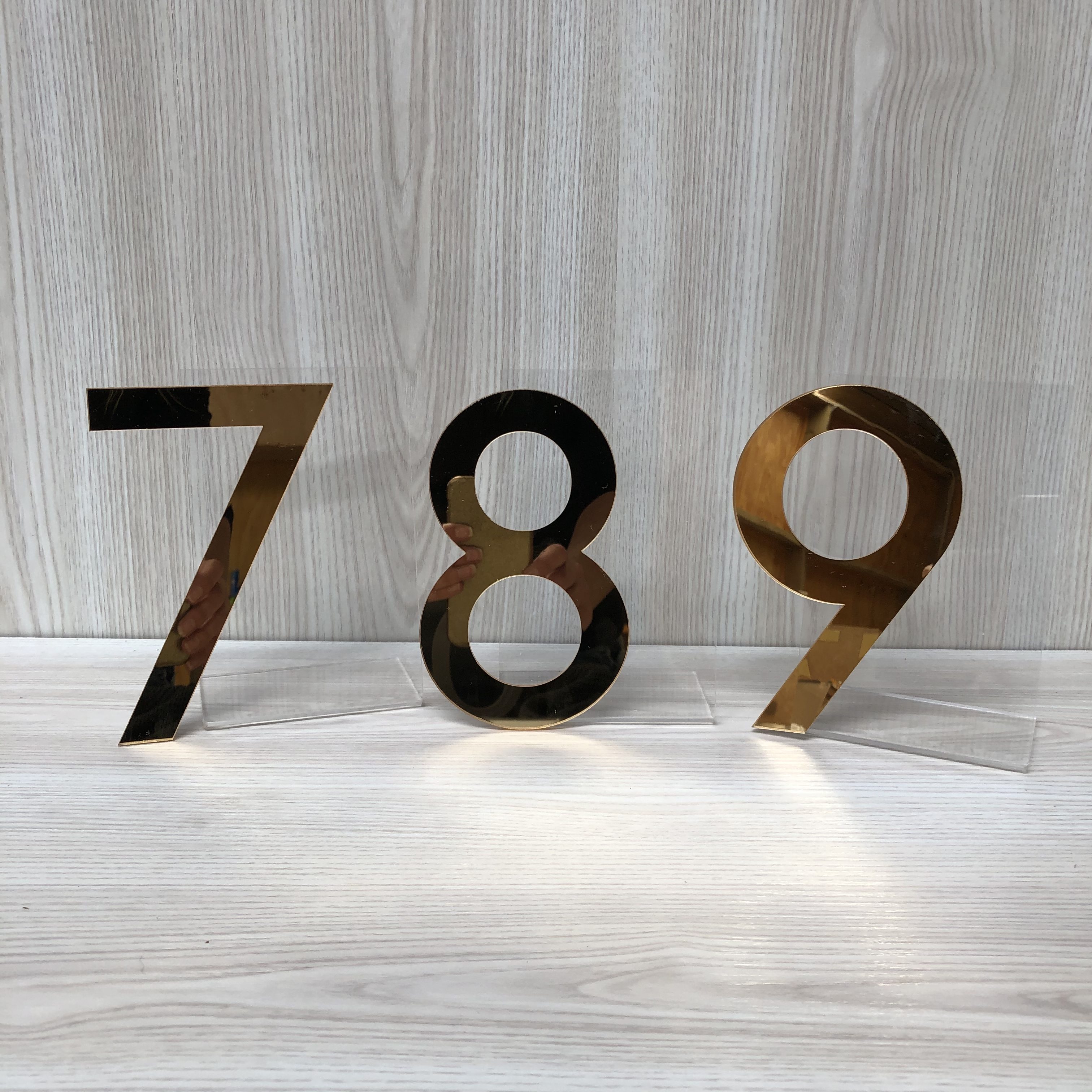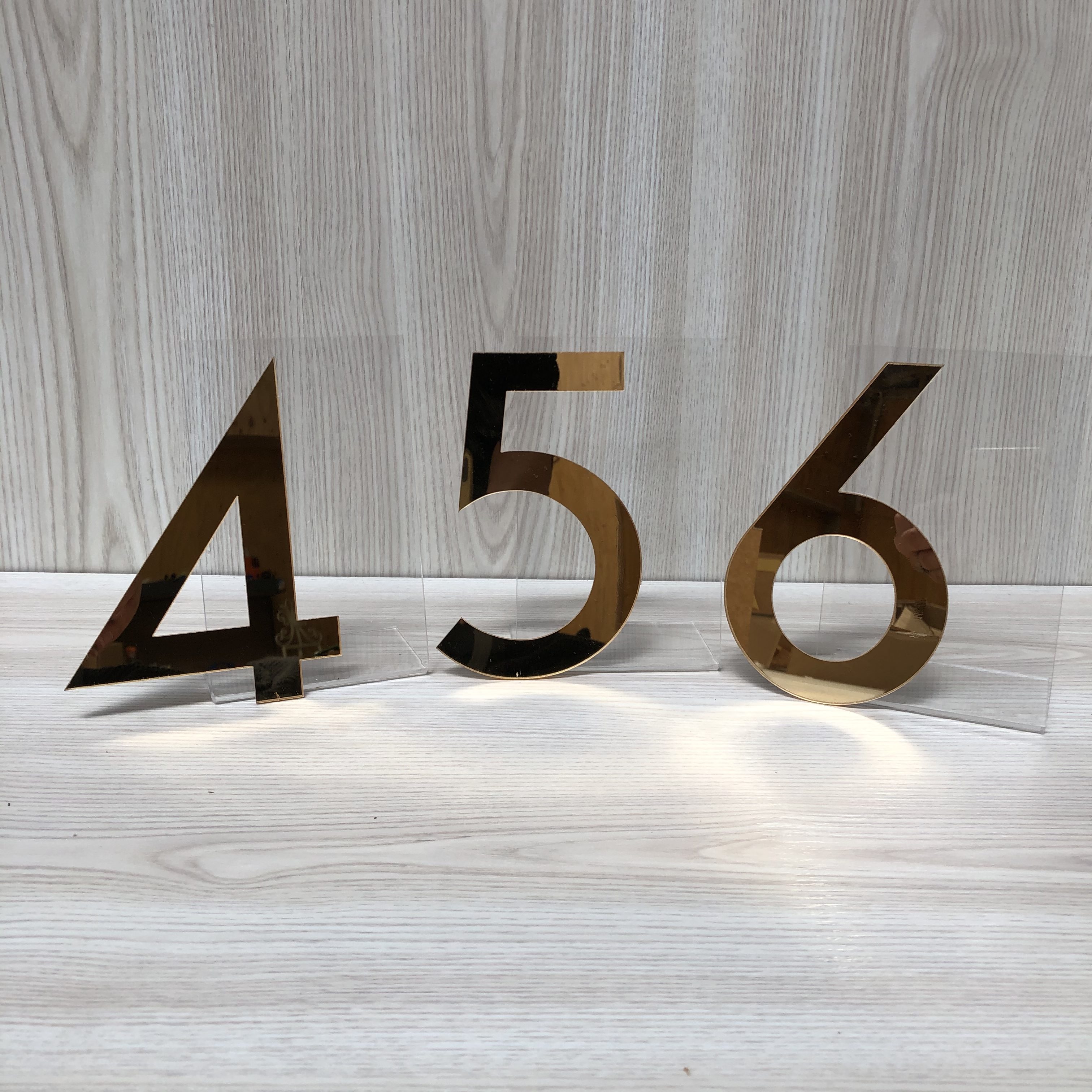 Add some sophistication to your table signage with these modern acrylic table numbers.  Made from clear acrylic with a gold mirror number on the front (one sided).