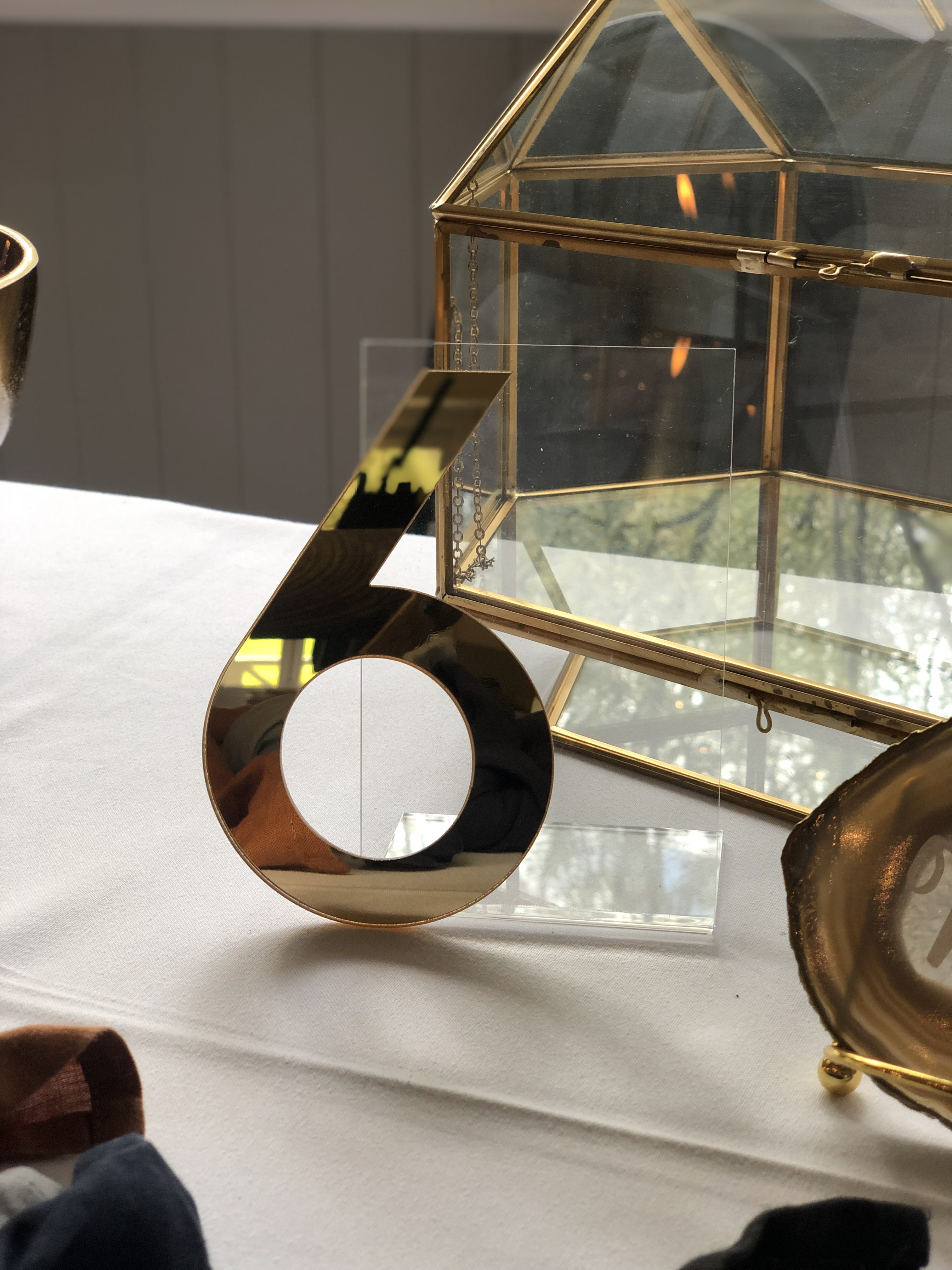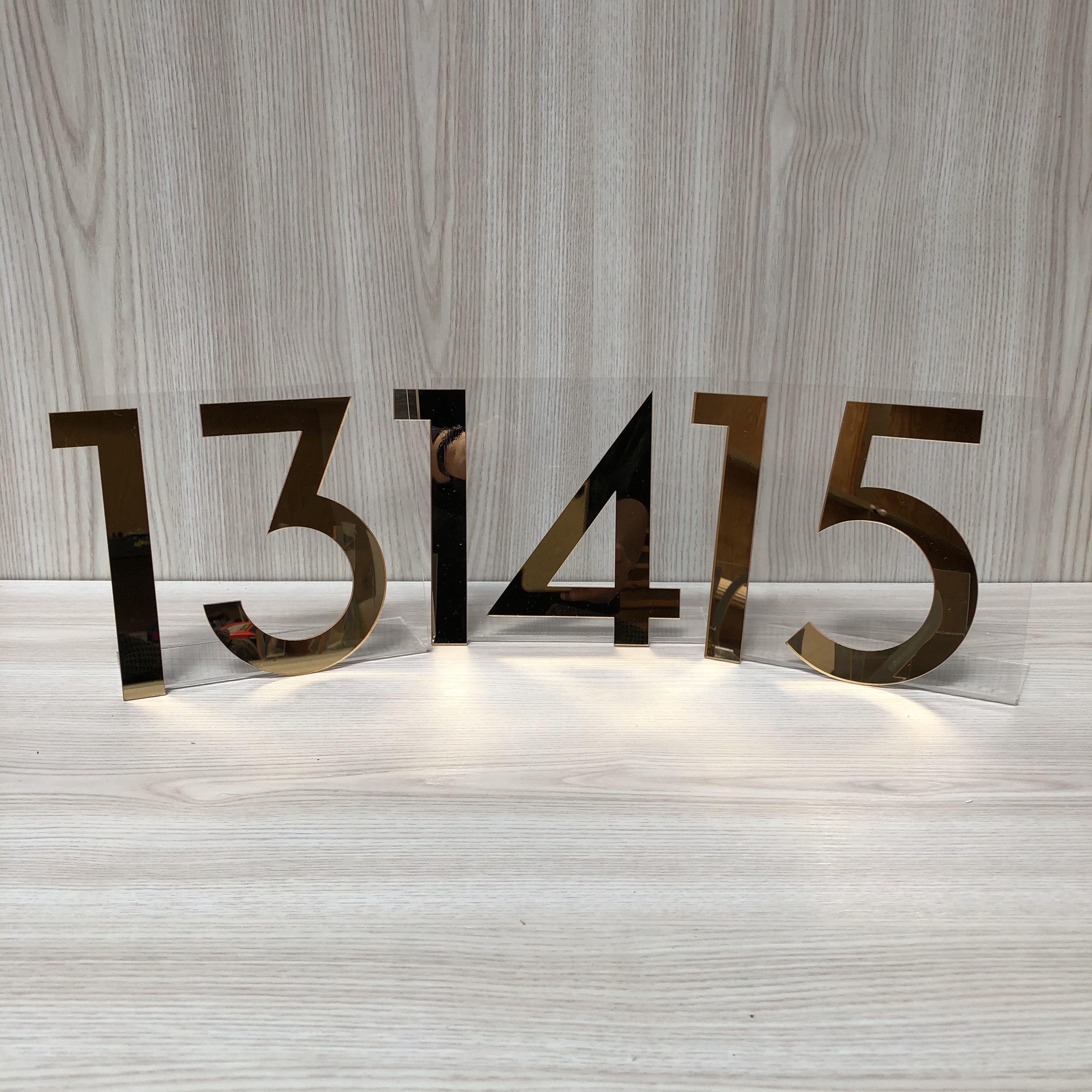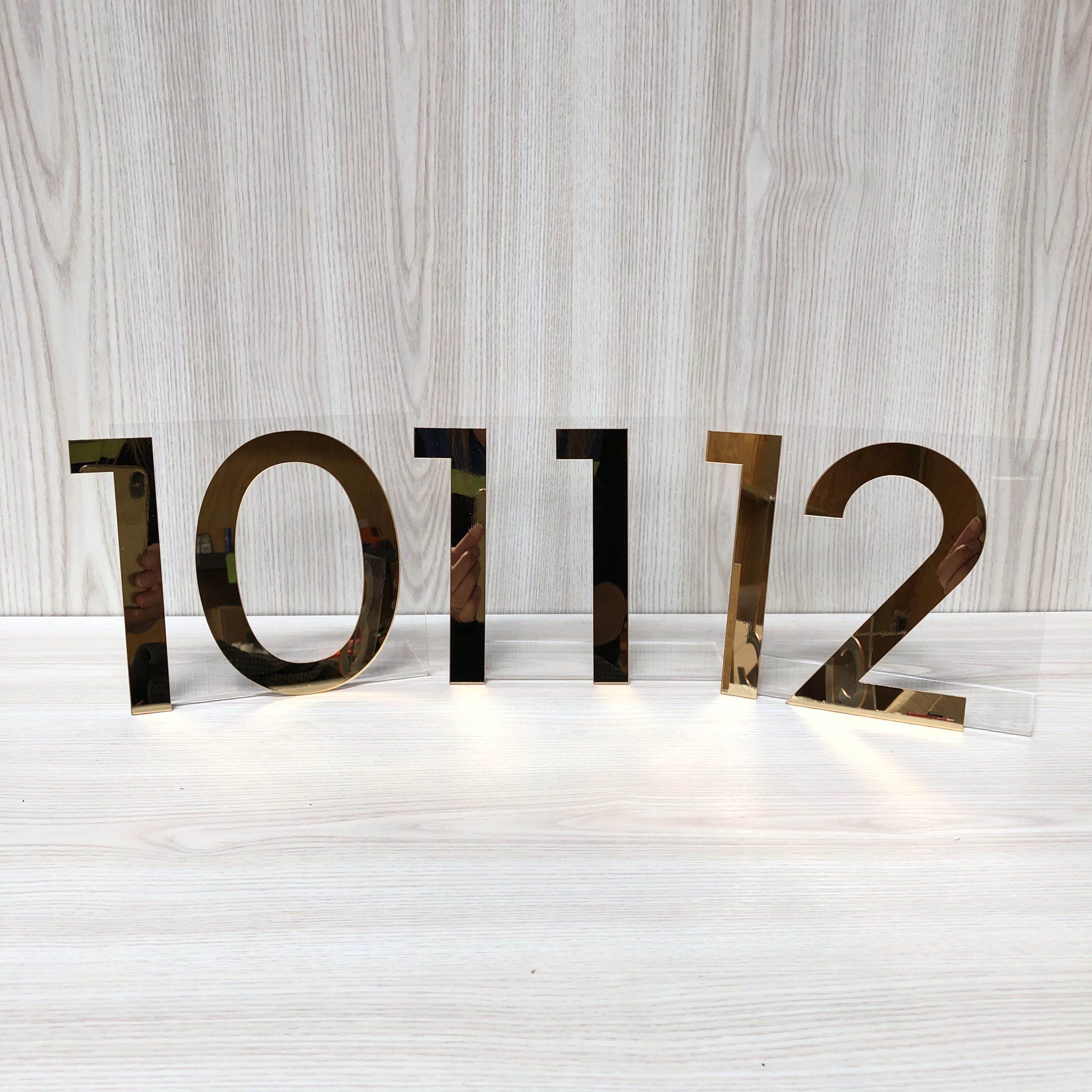 Add some sophistication to your table signage with these modern acrylic table numbers.  Made from clear acrylic with a gold mirror number on the front (one sided).