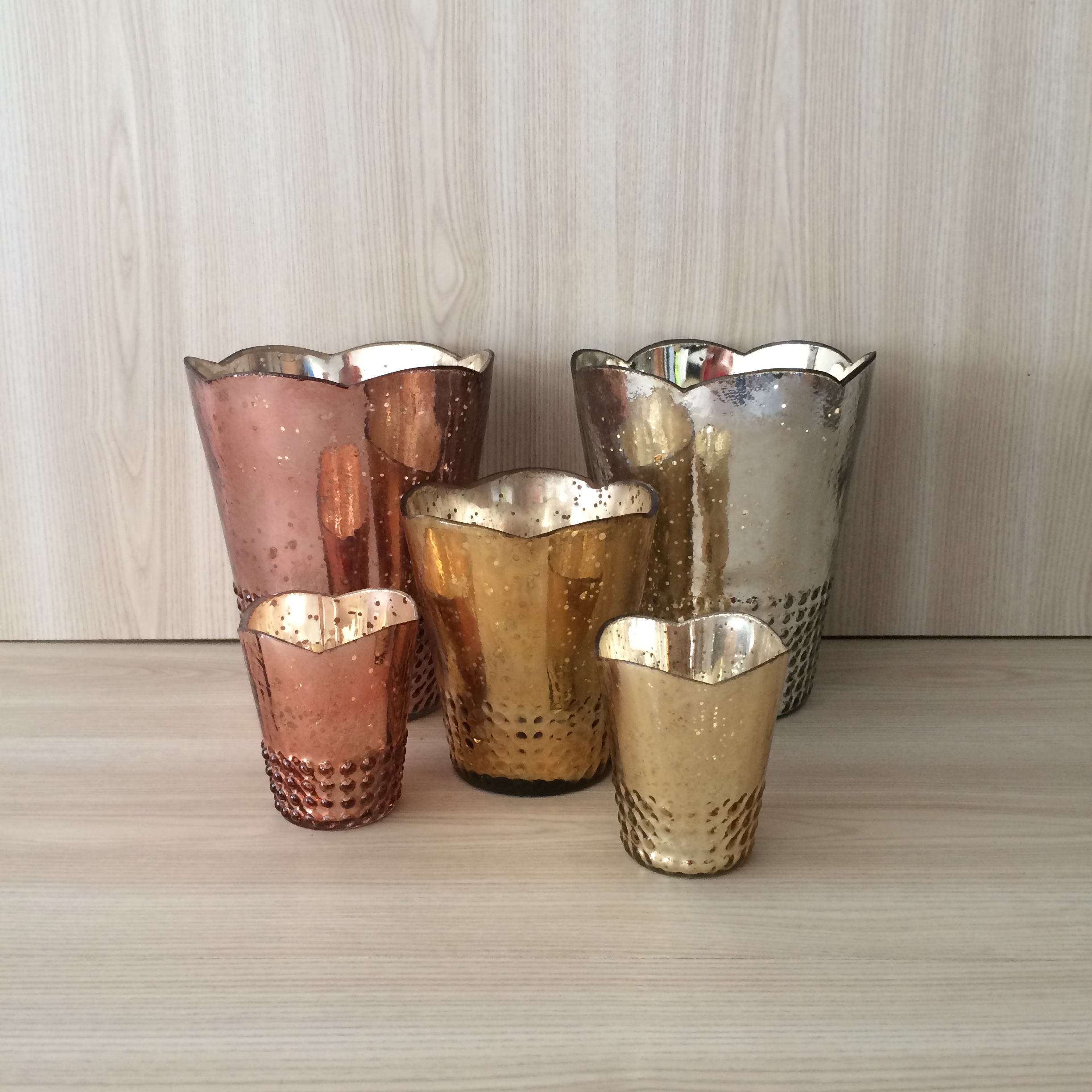 A pinky rose gold which is different to the other mercury glass we stock. Matches well with the copper cutlery and rose gold sequin table runners and tablecloths.