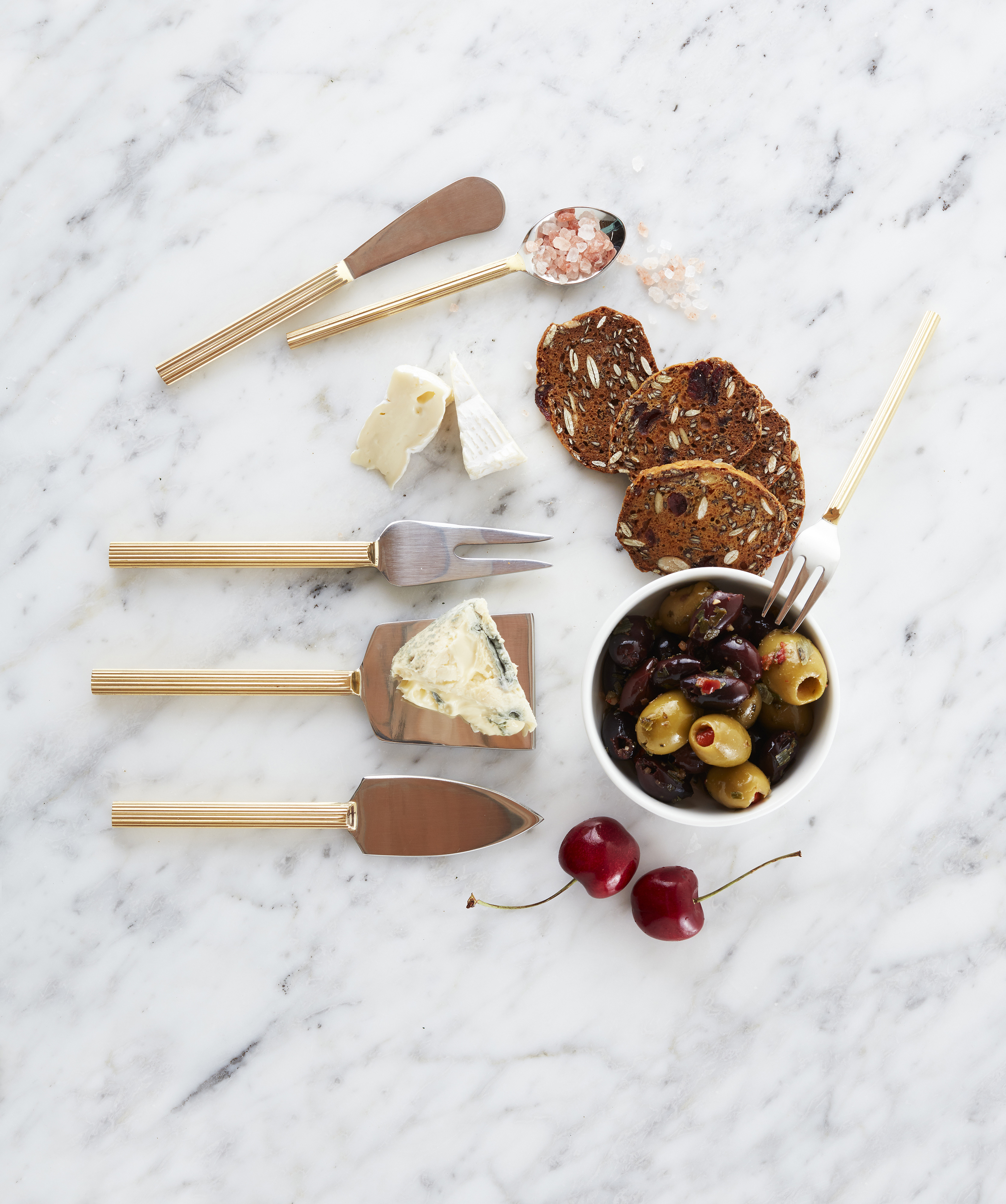 Three assorted designs in a classy matte gold lined handle with stainless steel blade. Varying designs for both soft and hard cheeses