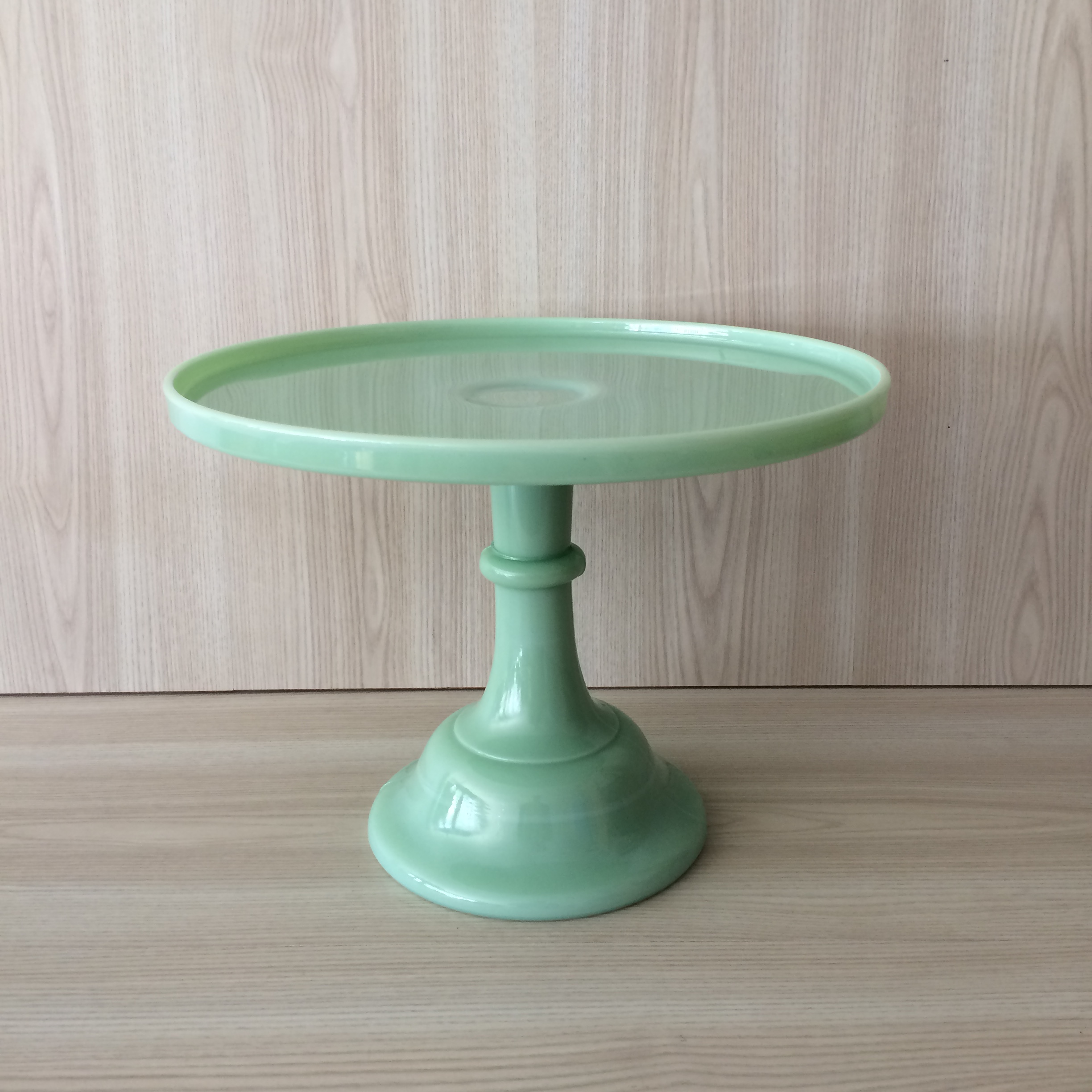 Milk Glass Pedestal Cake Stand made in the USA by Mosser Glass Co. Gorgeous pastel green coloured cake stands available in two sizes – Large and Medium
