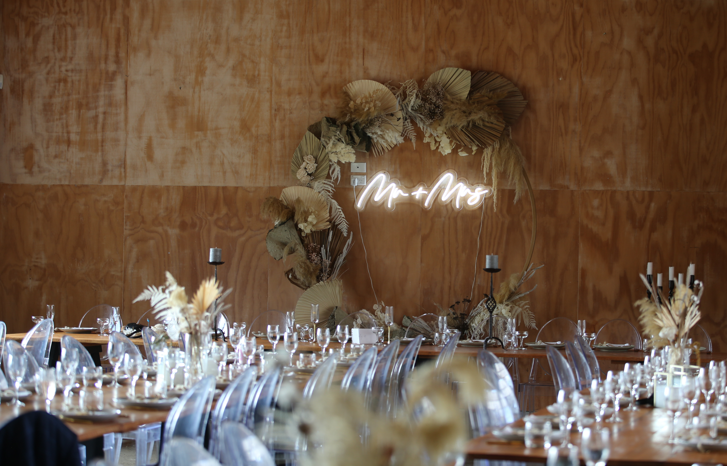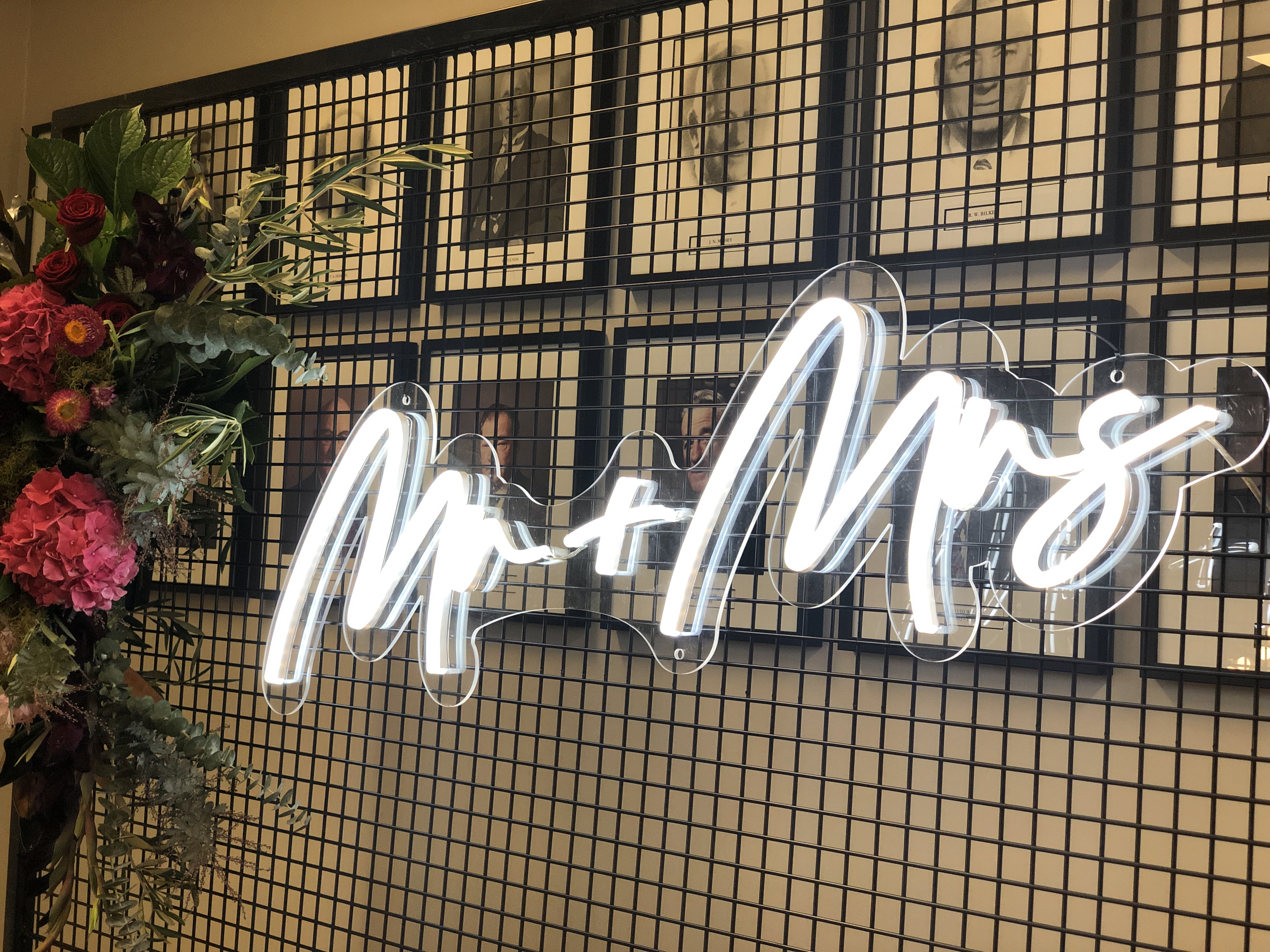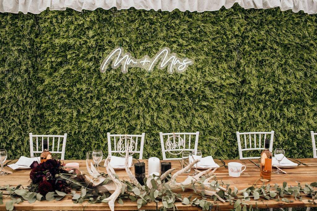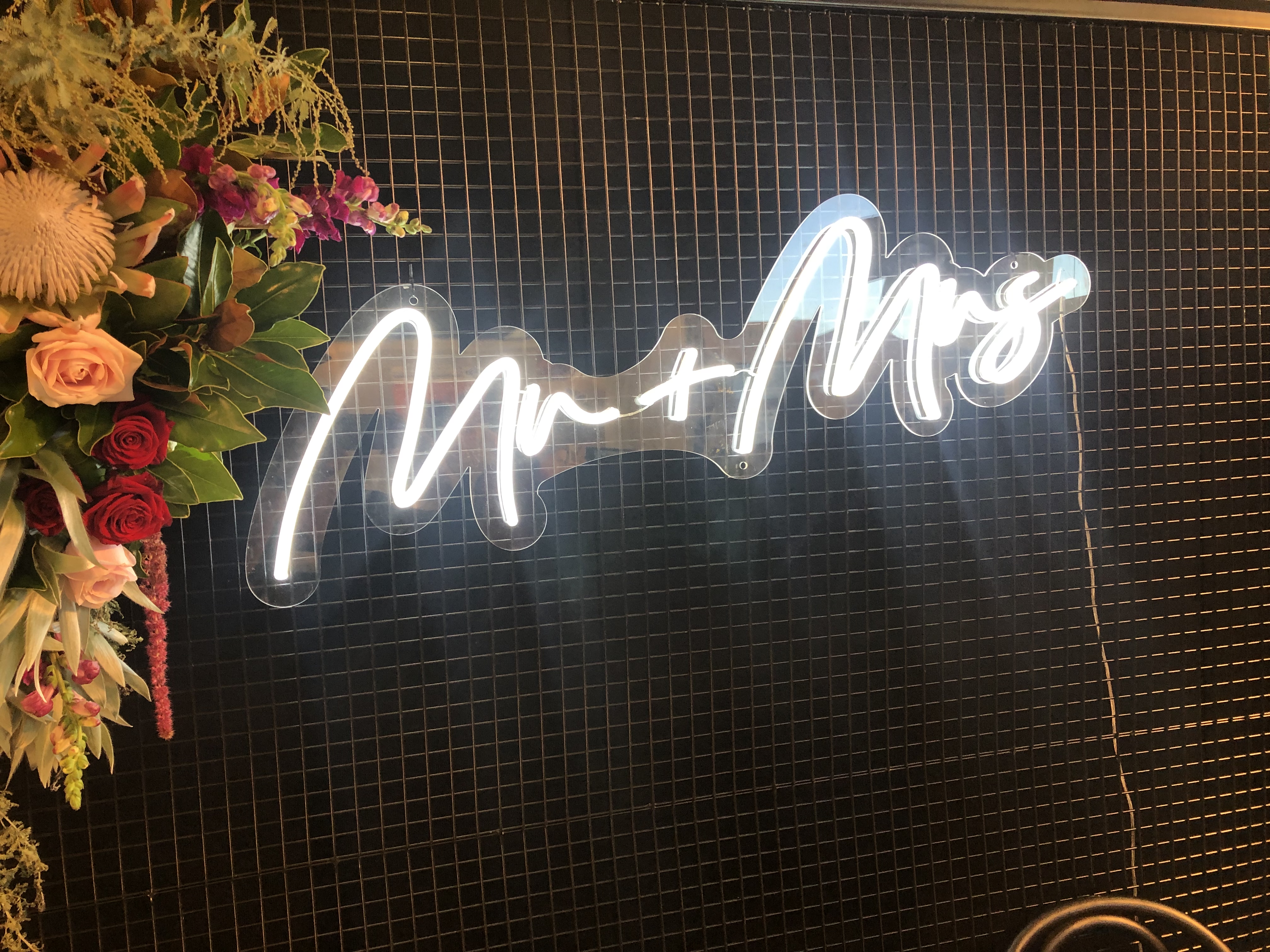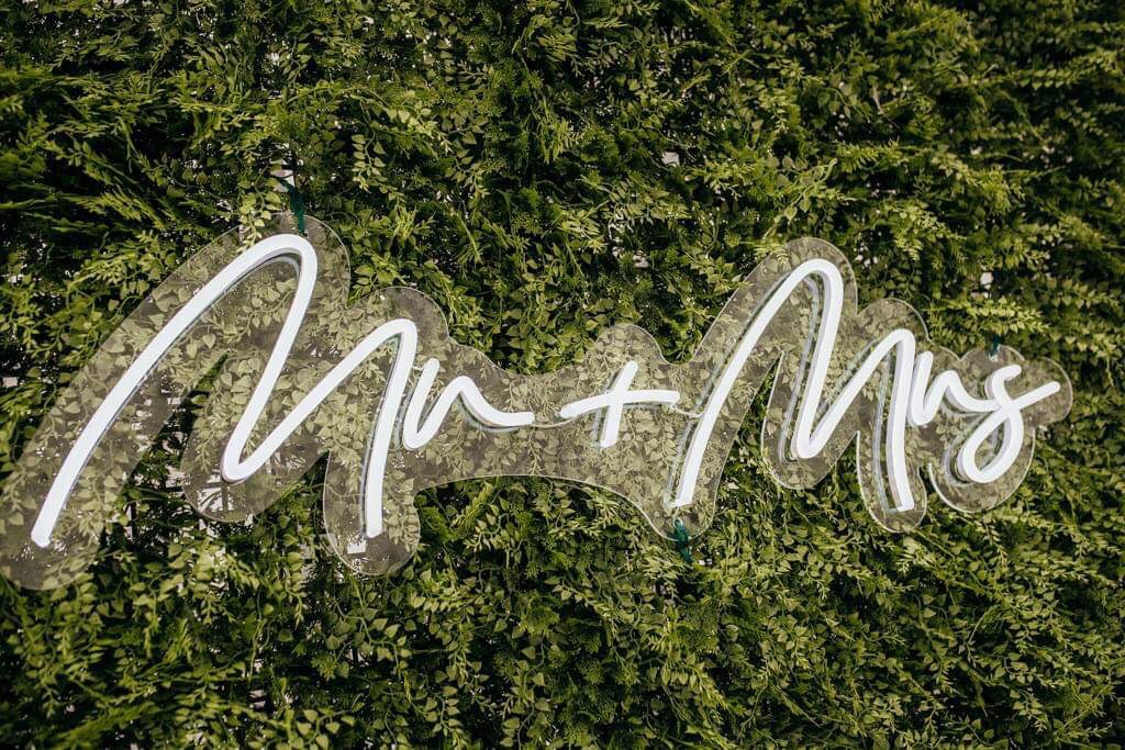 Announce your nuptials with this stunner of a sign.  Cool white neon in a flowing script, this Mr + Mrs sign would be perfect as a backdrop to the bridal table.  Nestle it in a flower or greenery wall for your photobooth backdrop – the options are endless