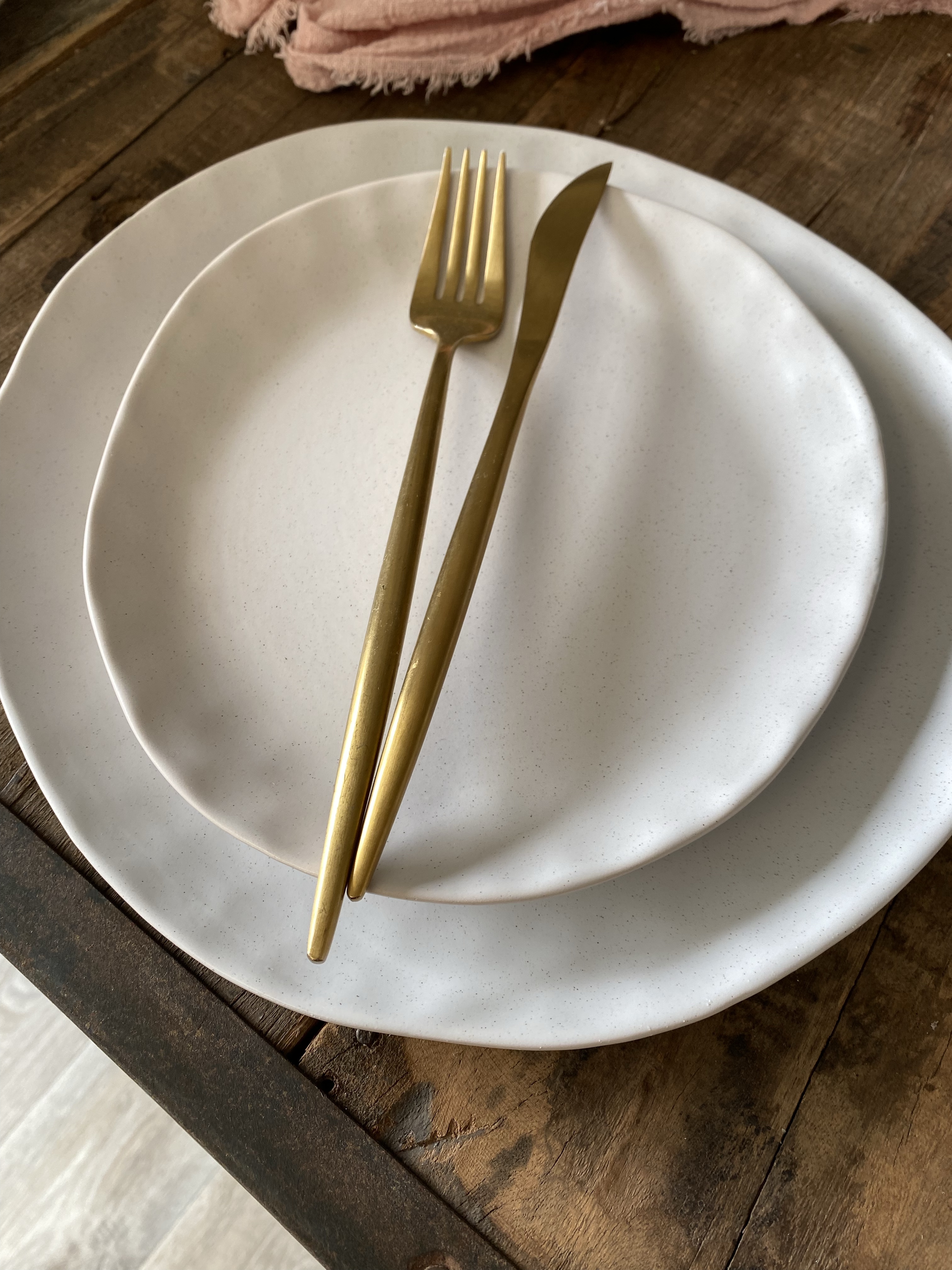 An organically shaped white flecked side plate, matching in style to the organic dinner plate