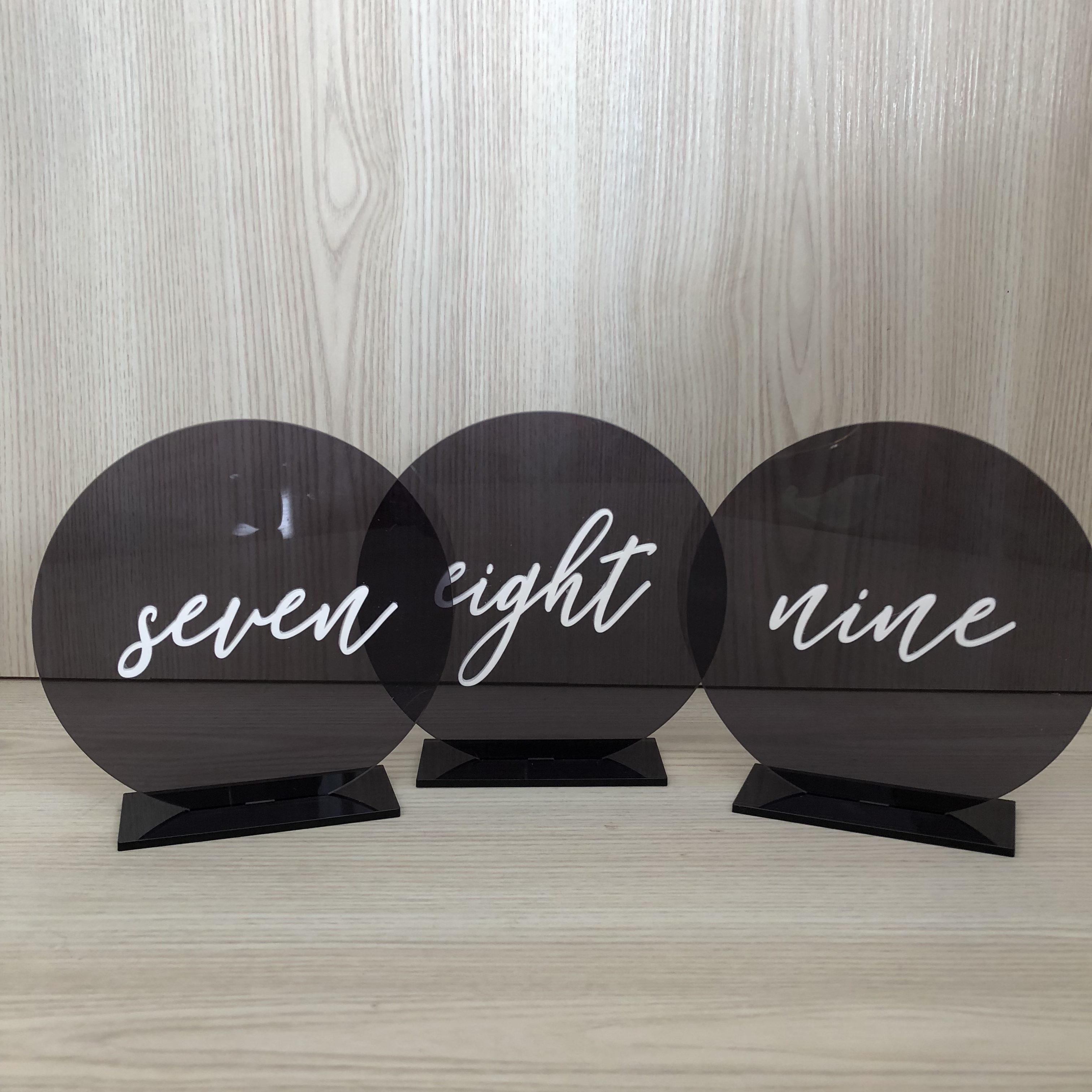 Add some sophistication to your directional signage with these modern round acrylic table numbers. Made from a smokey grey transparent acrylic with a white number on the front (one sided).