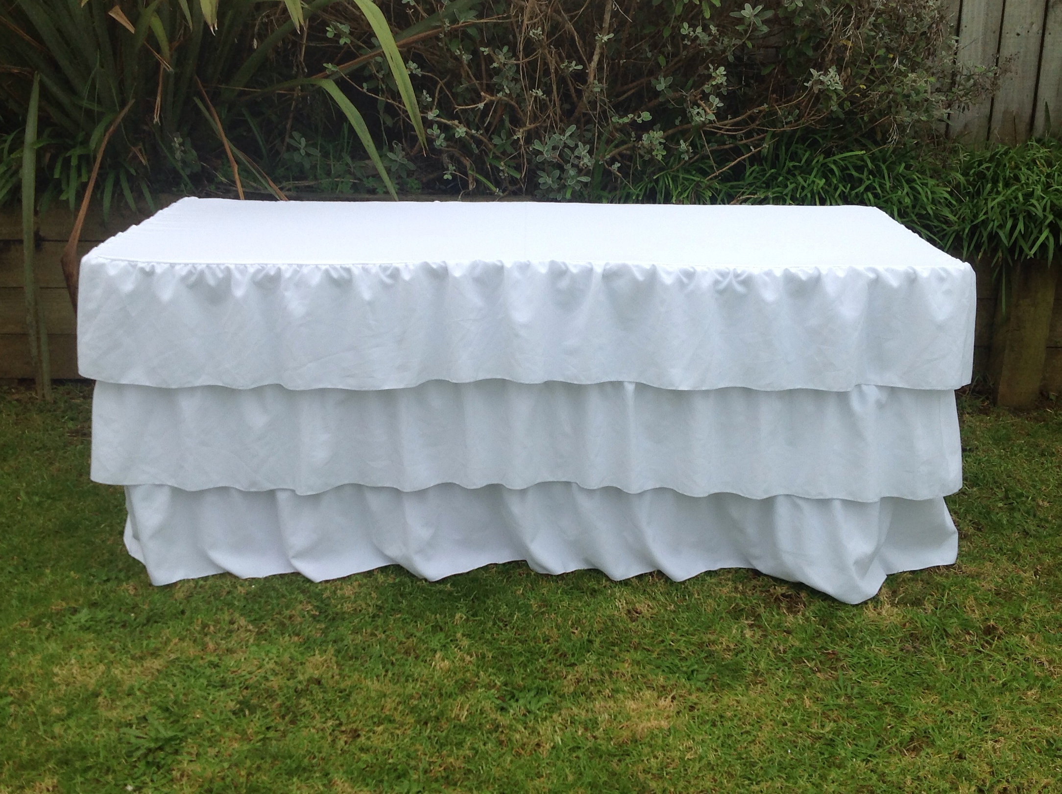 Make your table styling extra special with our beautiful ruffle trestle tablecloth in classic white. Featuring three tiers of soft, cascading ruffles, this statement piece adds texture, movement, and a touch of romance to any setup.