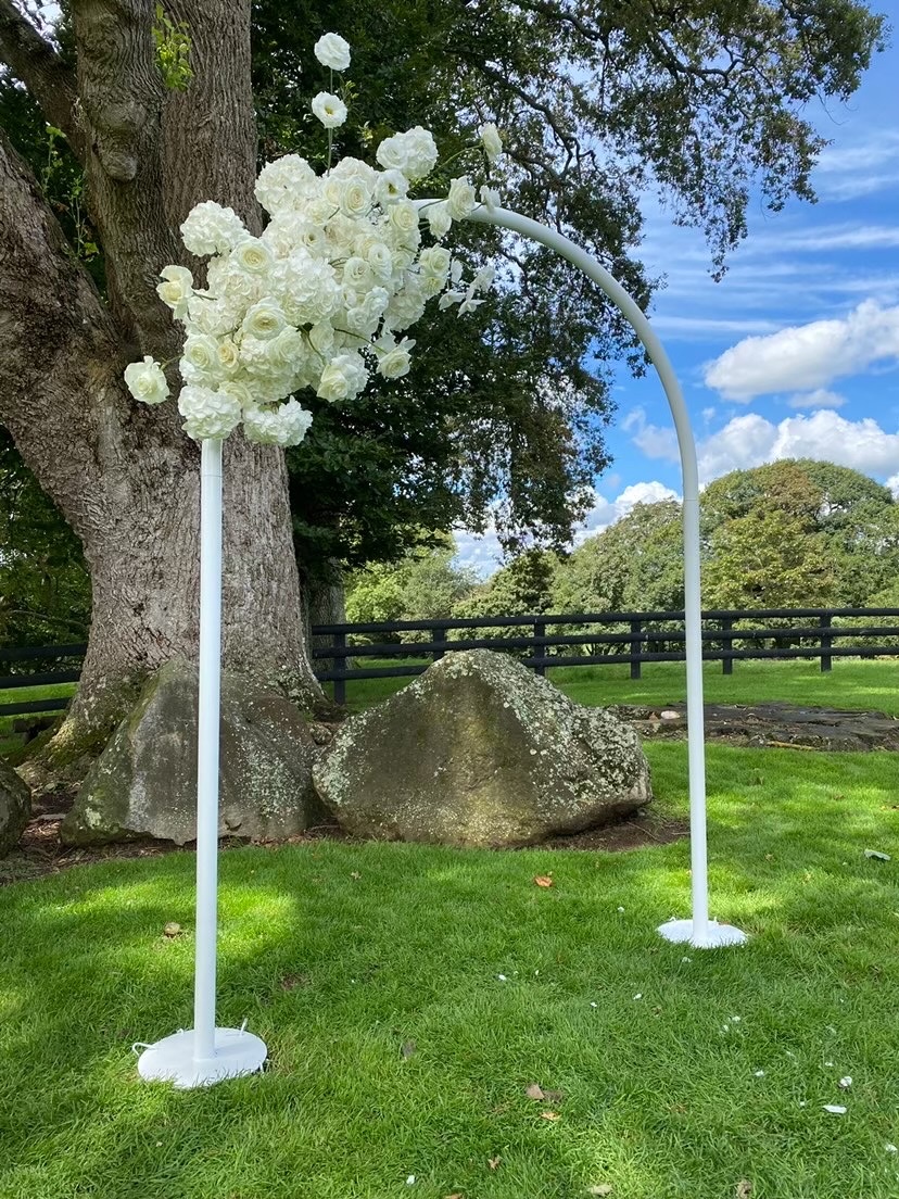 Made from sturdy 50mm tubing it breaks down into three pieces.   The round base has holes for you to peg it into the ground (not supplied).  There are small hooks on the back of the arch for you to secure your florals to it (or use cable ties).